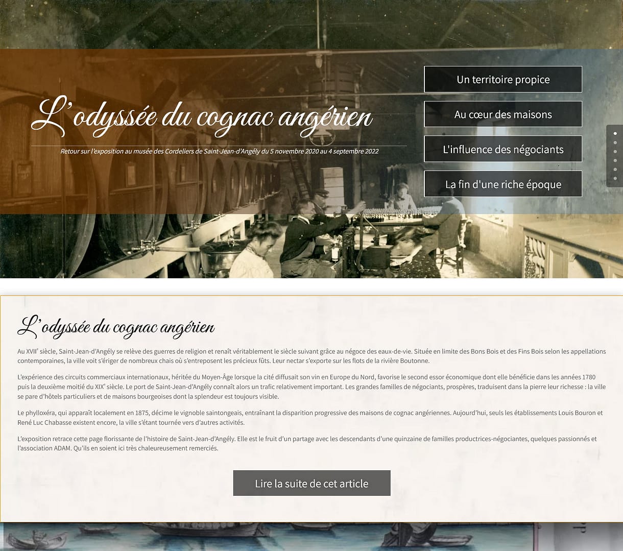 Présentation de l’exposition sur l’histoire viticole de la ville de Saint-Jean-d’Angély présentée au musée des Cordeliers de Saint-Jean-d’Angély du 5 novembre 2020 au 4 septembre 2022. La rédaction du texte du site a été assurée par l’équipe du musée, j’ai réalisé la mise en âge et l’intégration du site internet.